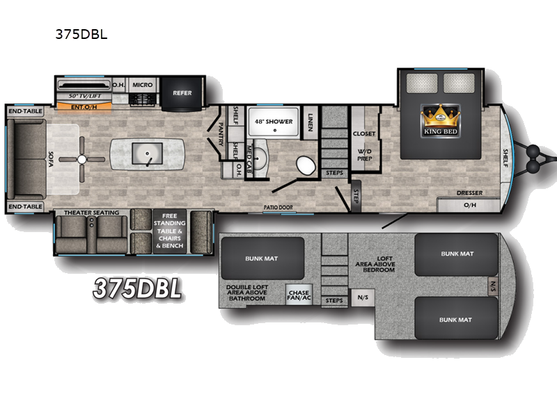 You can comfortably sleep seven people in this destination trailer, so invite more friends along! The little ones are sure to love the loft areas above the bedroom and bathroom. You will have the front private bedroom all to yourselves with a king bed slide out and plenty of space to relax and store your things. If you have any other guests, they can sleep on the hide-a-bed sofa at the back of the trailer. You will find everything you need in this residential kitchen with an island, an Insignia four burner cooktop, plus a double door pantry with shelves. And when your day is over you can relax in the rear living area on the theater seating across from the 50" lift TV and fireplace!