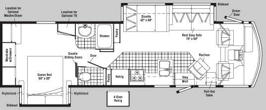 Step inside and you’re greeted by a spacious layout featuring a Rest Easy power sofa, a comfortable recliner, and a full dinette—giving you plenty of relaxing and dining options. The kitchen includes a 3-burner stove, refrigerator, microwave, and ample countertop space to make meals feel effortless.