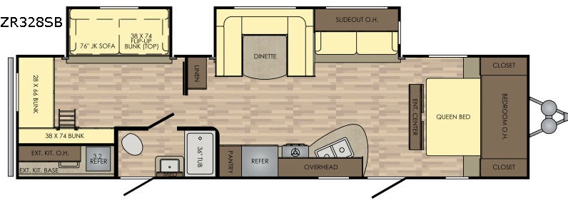 Next, notice the dual entry doors. As you step inside model ZR328SB using the main entrance towards the front you will see a bedroom to your right accessible through sliding doors on either side of the entertainment center. There is a queen bed with a closet on each side, and overhead storage above the head of the bed to help keep your things neat and organized.